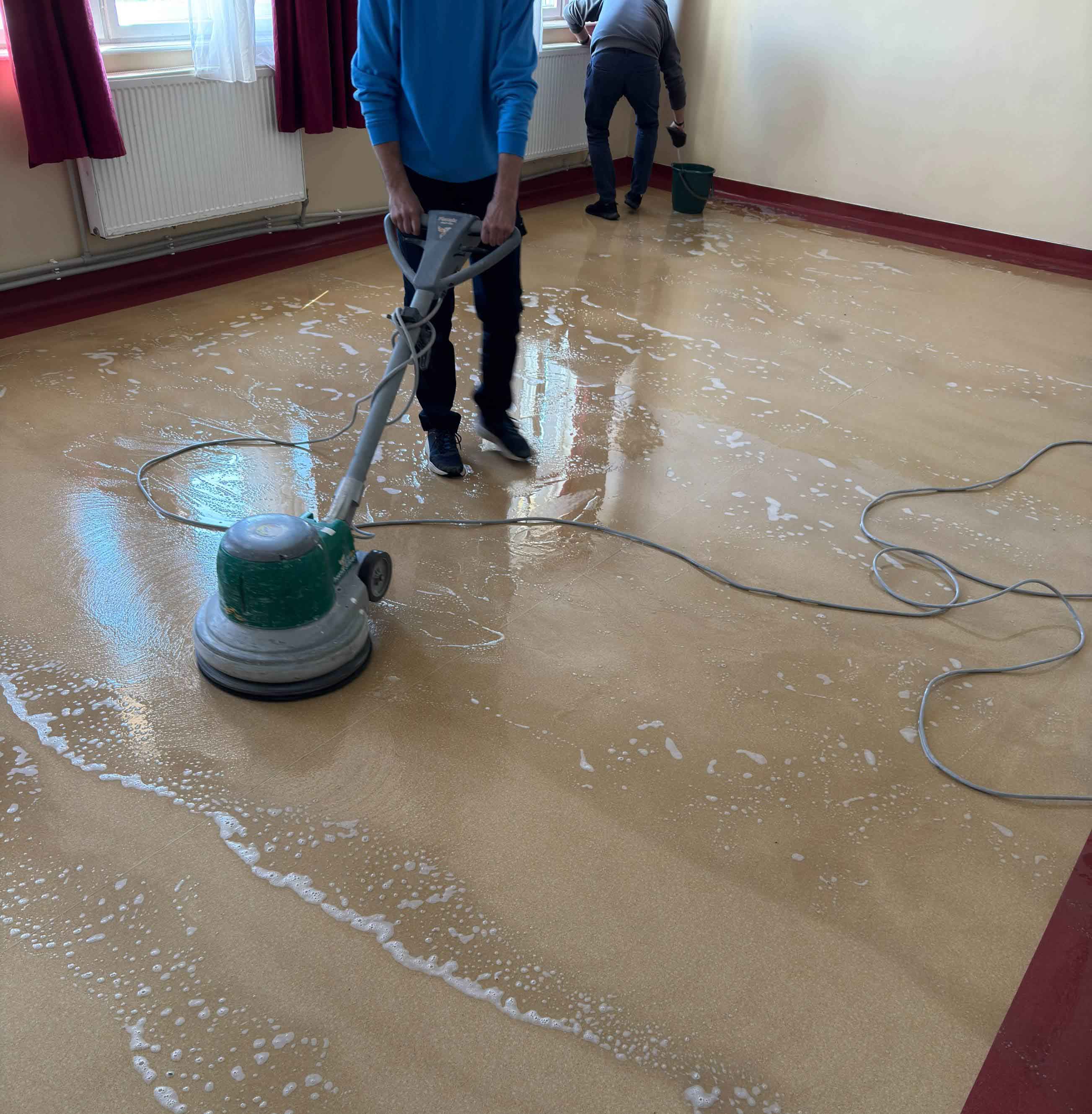 La Liceul Tehnologic nr.1 Corod, echipa Radu Solutions Group a recondiționat covorul PVC pe o suprafață totală de 162 mp, folosind produse profesionale destinate spațiilor cu trafic intens. Procesul a inclus curățarea profundă cu Clean & Strip, urmată de aplicarea stratului protector PU Sealer, pentru a reda luciul uniform și a prelungi durata de viață a pardoselii.